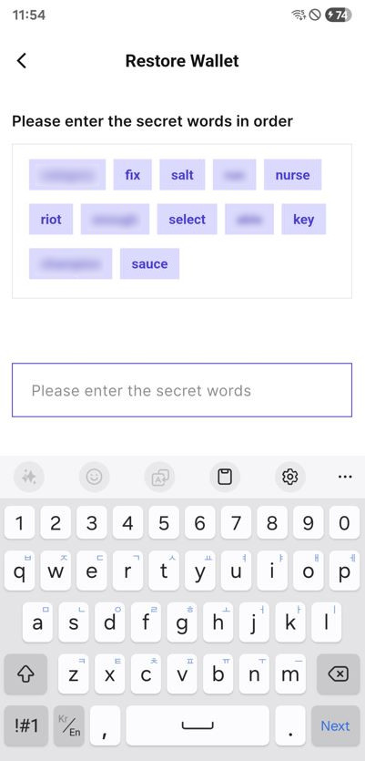 Select secret words (of wallet used by Kaia Wallet or Metamask) in order
